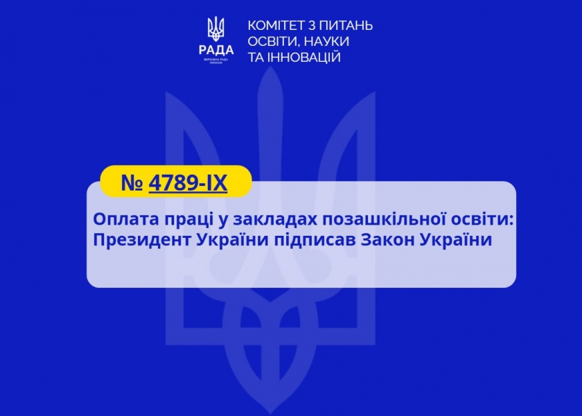 10 березня 2026 року Президентом України підписано Закон України № 4789-IX «Про внесення змін до статті 22 Закону України "Про позашкільну освіту" щодо оплати праці працівників закладів позашкільної освіти».