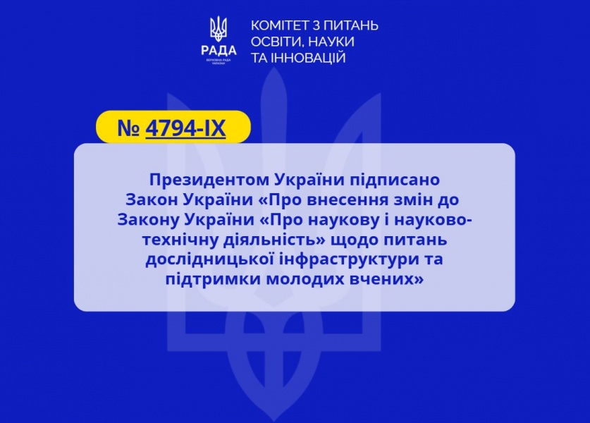 19 березня 2026 року Президентом України підписано Закон України 4794-IX «Про внесення змін до Закону України «Про наукову і науково-технічну діяльність» щодо питань дослідницької інфраструктури та підтримки молодих вчених».