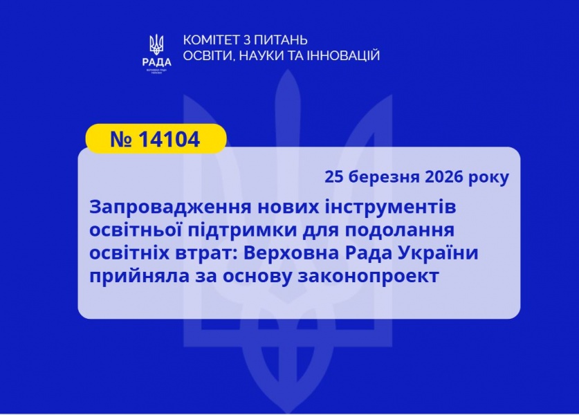 Верховна Рада України 25 березня 2026 року за результатами розгляду в першому читанні прийняла за основу проект Закону України «Про внесення змін до деяких законів України щодо розширення форм державної підтримки у сфері освіти» (реєстр. № 14104 від 08.10.2025).